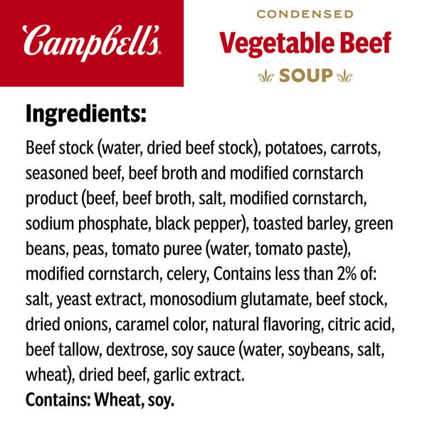 Beef Stock, Potatoes, Carrots, Seasoned Beef (contains Up To 10% Of A Solution Of Water, Salt, Sodium Phosphate), Green Beans, Peas, Toasted Barley, Modified Food Starch, Celery, Contains Less Than 2% Of: Salt, Yeast Extract, Tomato Paste, Monosodium Glutamate, Dehydrated Onions, Flavoring, Caramel Color, Beef Flavor (contains Beef Stock, Yeast Extract), Hydrolyzed Yeast Protein, Hydrolyzed Soy Protein, Citric Acid, Beef Fat, Dextrose, Hydrolyzed Wheat Gluten, Celery Extract, Garlic Extract.