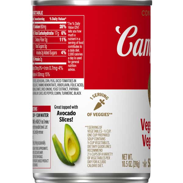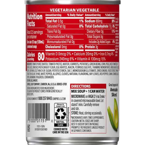 Cozy up with a steamy bowl of Campbell’s® Condensed Vegetarian Vegetable Soup. A family favorite for generations, this vegetarian soup is crafted with farm-grown vegetables like carrots, green beans and corn plus alphabet-shaped pasta in a tomato base. The result is a canned vegetable soup that contains one serving of veggies in every cup. Top it with avocado slices, season it with fresh herbs, or pair it with a sandwich or salad for something quick and easy. This convenient canned soup is a year-round pantry staple and the perfect comfort food on a chilly day or when you’re feeling under the weather. Simply mix the condensed soup with 1 can of water and microwave on high for 2.5 to 3 minutes in a covered, microwave-safe bowl, or heat in a pot on the stove, stirring occasionally. Each 10.5 oz recyclable can contains about 2.5 servings of microwave soup and features a non-BPA lining. From Vegetarian Vegetable to Cream of Mushroom and everything in between, Campbell’s® makes delicious soups in flavors your family knows and loves with quality, farm-grown ingredients in every cup. M’m! M’m! Good!®