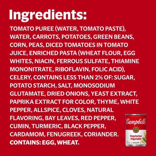 Tomato Puree (water, Tomato Paste), Water, Carrots, Potatoes, Green Beans, Corn, Peas, Diced Tomatoes In Tomato Juice, Enriched Pasta (wheat Flour, Egg Whites, Niacin, Ferrous Sulfate, Thiamine Mononitrate, Riboflavin, Folic Acid), Celery, Contains Less Than 2% Of: Sugar, Potato Starch, Salt, Monosodium Glutamate, Dried Onions, Yeast Extract, Paprika Extract For Color, Thyme, White Pepper, Allspice, Cloves, Natural Flavoring, Bay Leaves, Red Pepper, Cumin, Turmeric, Black Pepper, Cardamom, Fenugreek, Coriander