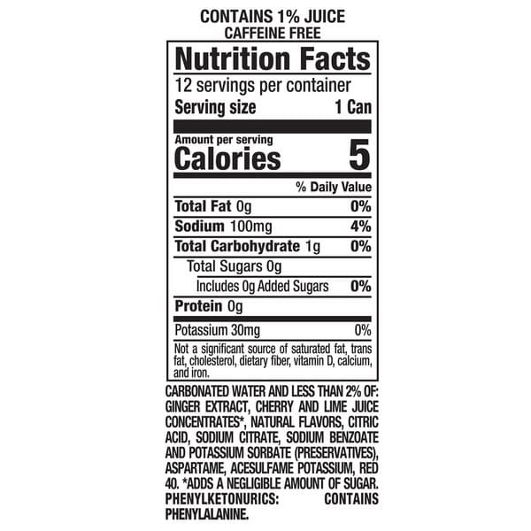 Carbonated Water, Less Than 2% Of: Ginger Extract, Cherry And Lime Juice Concentrates*, Natural Flavors, Citric Acid, Sodium Citrate, Sodium Benzoate And Potassium Sorbate (preservatives), Aspartame, Acesulfame Potassium, Red 40, *adds A Negligible Amount Of Sugar