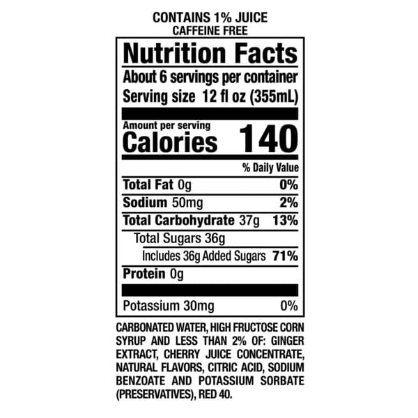 Carbonated Water, High Fructose Corn Syrup, Less Than 2% Of: Ginger Extract, Cherry Juice Concentrate, Natural Flavors, Citric Acid, Sodium Benzoate And Potassium Sorbate (preservatives), Red 40