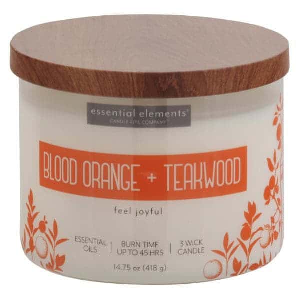Contains essential oils in a soy wax blend. More fragrance! Approx. burn time 25-45 hours. Facebook – Essential Elements. www.candle-lite.com. Wick contains no lead. Made in the USA with USA & foreign parts/materials.