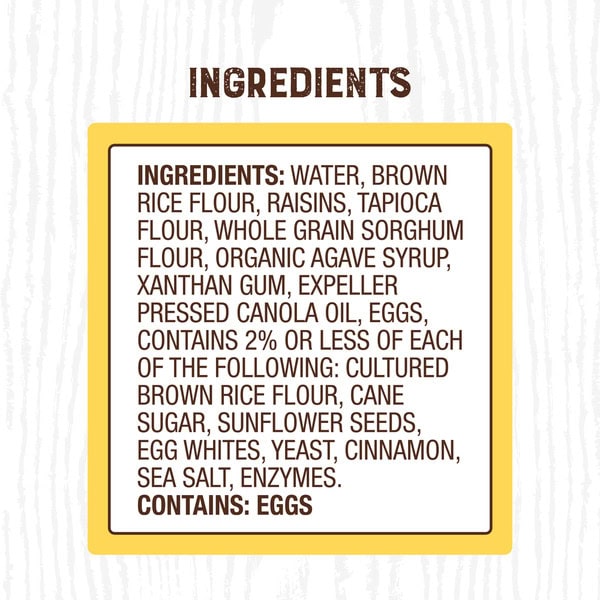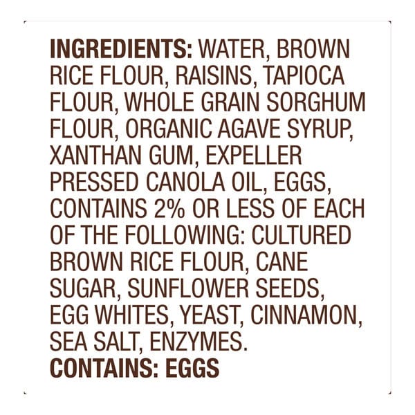 Water, Brown Rice Flour, Raisins, Tapioca Flour, Whole Grain Sorghum Flour, Organic Agave Syrup, Xanthan Gum, Expeller Pressed Canola Oil, Eggs, Contains 2% Or Less Of Each Of The Following: Cultured Brown Rice Flour, Cane Sugar, Sunflower Seeds, Egg Whites, Yeast, Cinnamon, Sea Salt, Enzymes.