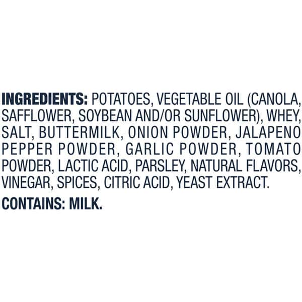 Potatoes, Vegetable Oil (canola, Safflower, Soybean And/or Sunflower), Whey, Salt, Buttermilk, Onion Powder, Jalapeno Epper Powder, Garlic Powder, Tomato Owder, Lactic Acid, Parsley, Natural Flavors Vinegar, Spices, Citric Acid, Yeast Extract