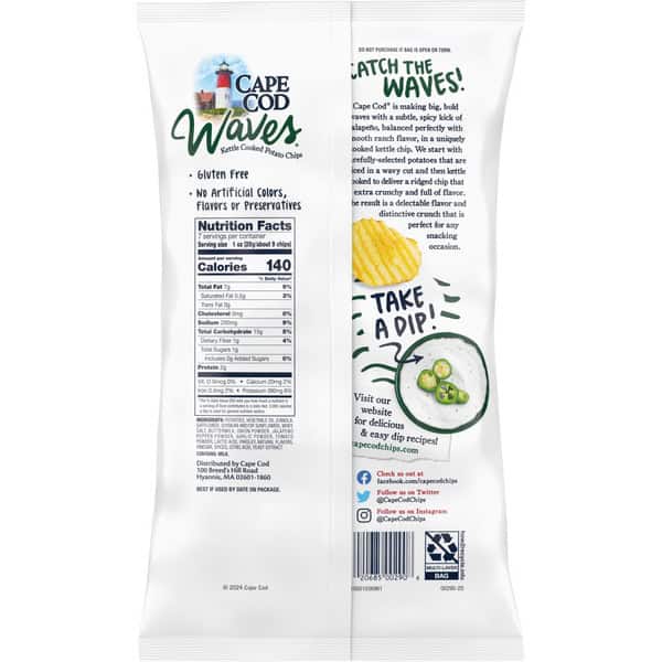 Try the extra crunchy ridges and spicy and smooth taste Cape Cod Waves Jalapeno Ranch potato chips. Made with choice potatoes that are sliced in a wavy cut, these chips are then kettle cooked to deliver a ridged chip that is extra crunchy and full of flavor. The unique wave shape of these kettle chips is crafted to hold up to dip.