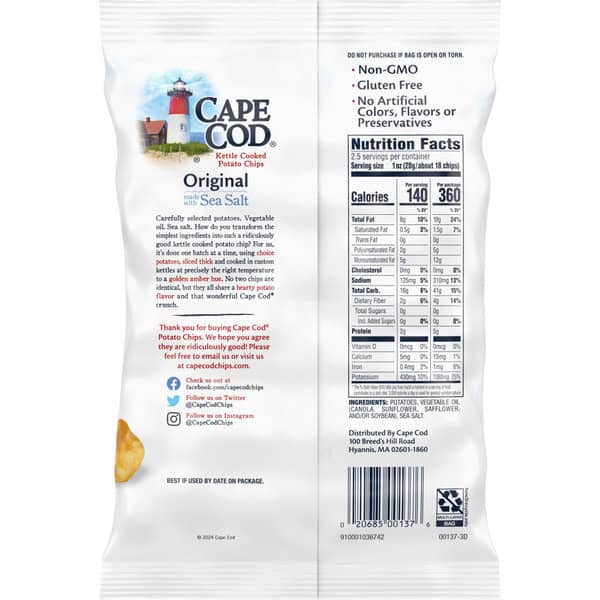 Cape Cod Potato Chips are known for their quality taste, hearty crunch and distinctly remarkable flavors. These delicious chips are made with premium ingredients beginning with oil, salt and potatoes. Available in many traditional and unique varieties, Cape Cod Potato Chips maintain the tradition of using high quality ingredients in all its snacks.