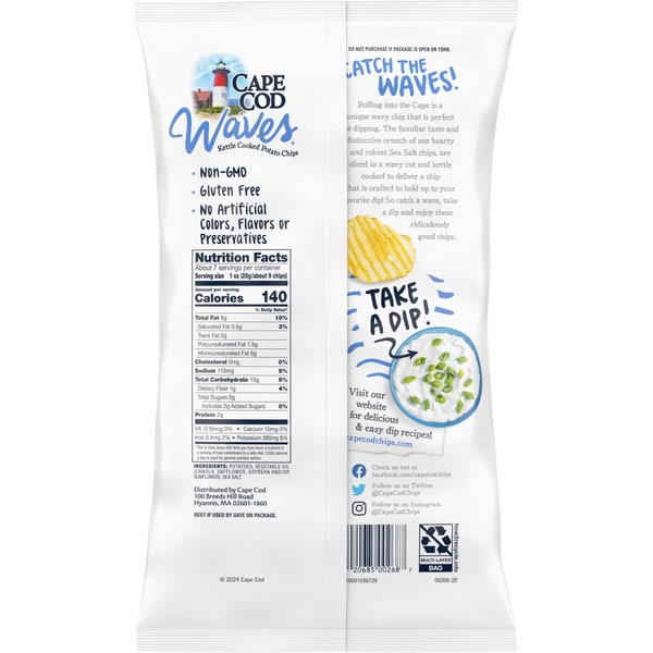 Try the extra crunchy ridges and delectable flavor of Cape Cod Waves Original potato chips. Made with choice potatoes that are sliced in a wavy cut, these chips are then kettle cooked to deliver a ridged chip that is extra crunchy and full of flavor. The unique wave shape of these kettle chips is crafted to hold up to dip.