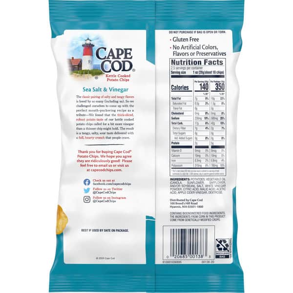 Cape Cod Potato Chips are known for their quality taste, hearty crunch and distinctly remarkable flavors. These delicious chips are made with premium ingredients beginning with oil, salt and potatoes. Available in many traditional and unique varieties, Cape Cod Potato Chips maintain the tradition of using high quality ingredients in all its snacks.