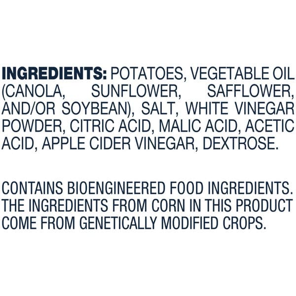 Potatoes, Vegetable Oil Canola, Sunflower, Safflower And/or Soybean), Salt, White Vinegar Powder, Citric Acid, Malic Acid, Acetic Acid, Apple Cider Vinegar, Dextrose
