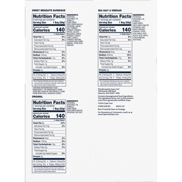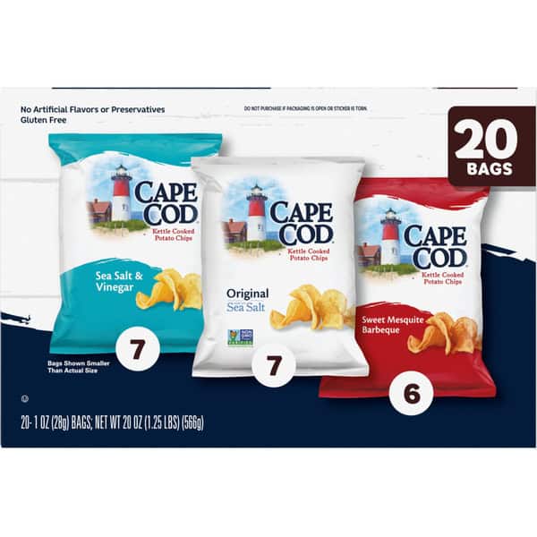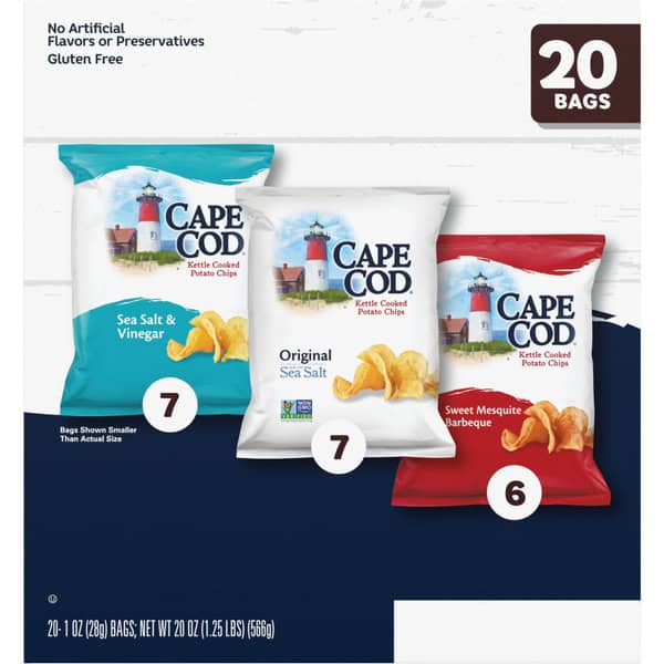 Get all of Cape Cod Kettle Chips top flavors in our delicious, 20-count variety pack: Sea Salt & Vinegar, Original, and Sweet Mesquite Barbeque. Choice Cape Cod kettle-cooked potato chips are made with carefully selected potatoes, oil, and salt, along with special seasonings. The variety pack has 7 single-serve snack bags of Sea Salt & Vinegar, 7 single-serve snack bags of Original and 6 single-serve snack bags of Sweet Mesquite Barbeque chips.