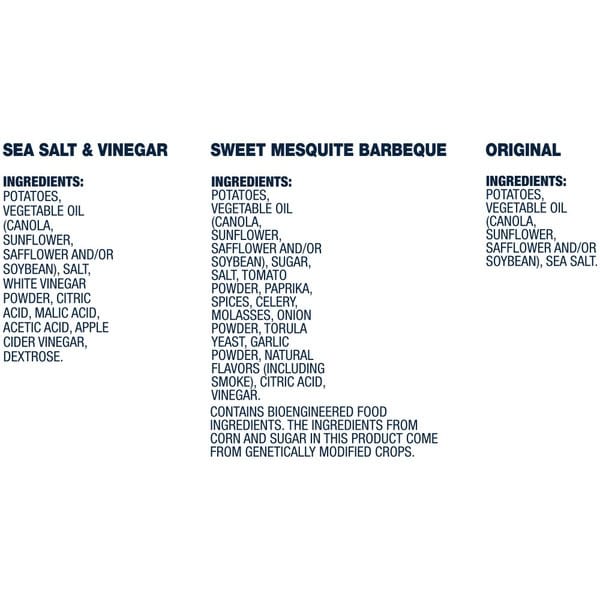 Sweet Mesquite Barbeque – Potatoes, Vegetable Oils (canola, Sunflower And/or Safflower), Sugar, Salt, Paprika, Tomato Powder, Molasses, Onion Powder, Spices, Citric Acid, Natural Flavor (including Smoke), Garlic Powder, Vinegar, Torula Yeast,sea Salt & Vinegar – Potatoes, Vegetable Oils (canola, Sunflower And/or Safflower), Salt, White Vinegar Powder, Citric Acid, Malic Acid, Acetic Acid, Apple Cider Vinegar, Dextrose,original – Potatoes, Vegetable Oils (canola, Sunflower And/or Safflower), Sea Salt