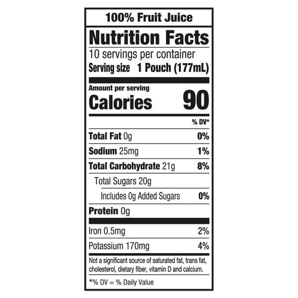 • Each pouch contains 3/4 cup of fruit juice