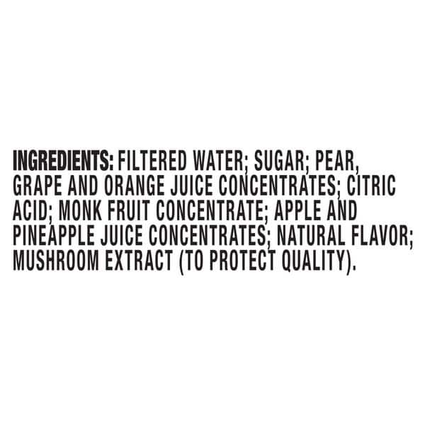 Ngredients: Filtered Water; Sugar; Pear Grape And Orange Juice Concentrates; Citric Acid; Monk Fruit Concentrate; Apple And Ineapple Juice Concentrates; Natural Flavor; Mushroom Extract (to Protect Quality)