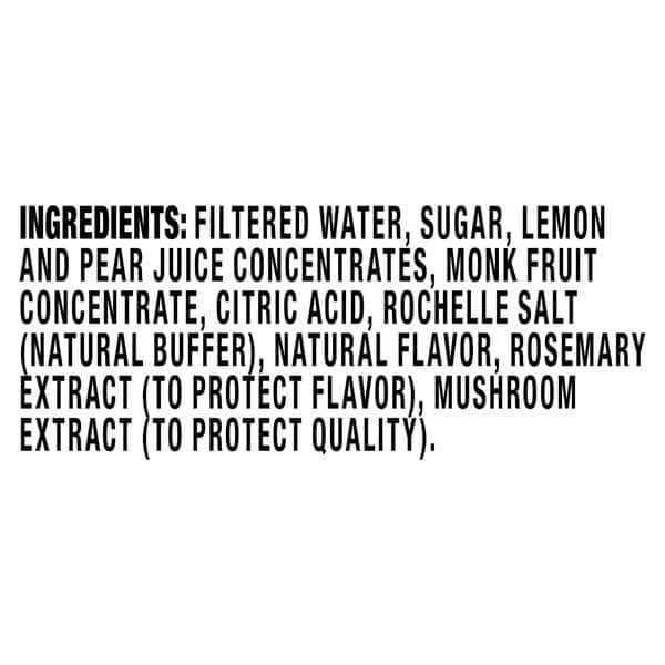 Filtered Water, Sugar, Lemon And Pear Juice Concentrates, Monk Fruit Concentrate, Citric Acid, Rochelle Salt (natural Buffer), Natural Flavor, Rosemary Extract (to Protect Flavor), Mushroom Extract (to Protect Quality)