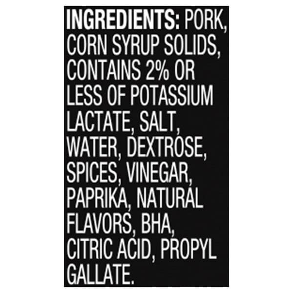 Pork, Corn Syrup Solids, Contains 2% or Less of Potassium Lactate, Salt, Water, Dextrose, Spices, Vinegar, Paprika, Natural Flavors, BHA, Citric Acid, Propyl Gallate.