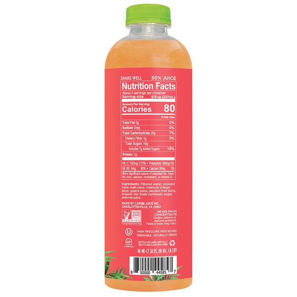 Filtered Water, Pressed Cane Stalk Juice, Valencia Orange Juice, Guava Juice, Passion Fruit Juice, Organic Fair Trade Turbinado Sugar, Acerola Juice.