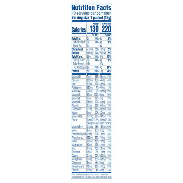 Nonfat Milk, Maltodextrin, Sugar, Vitamins And Minerals‡, Less Than 2% Of Lactose, Cellulose Gum, Natural Flavor, Salt, ‡vitamins And Minerals: Calcium Phosphate, Magnesium Hydroxide, Sodium Ascorbate, Choline Bitartrate, Dl-alpha Tocopheryl Acetate, Ferric Phosphate, Niacinamide, Manganese Sulfate, Copper Gluconate, Zinc Oxide, Calcium Pantothenate, Pyridoxine Hydrochloride, Thiamine Mononitrate, Vitamin A Palmitate, Riboflavin, Folic Acid, Vitamin K₁, Chromium Chloride, Sodium Molybdate, Vitamin D₃, Biotin