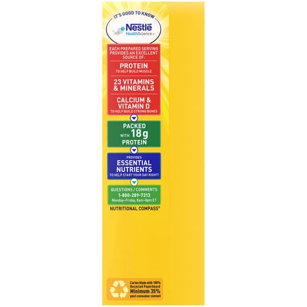 Naturally & artificially flavored powder drink mix. Per Prepared Serving: 18 g protein; 24 vitamins & minerals; 4x calcium of 5.3 oz cup of Greek yogurt; 2x vitamin D of an 8 fl oz glass of milk. Nutritional Compass: Nestle Health Science – It’s good to know. Excellent source of: protein to help build muscle; calcium & vitamin D to help build strong bones; 24 vitamins & minerals in each prepared serving. Packed with 18 g protein to help start your day right. Questions/Comments: 1-800-289-7313 Monday-Friday, 8am-8pm Eastern Time. Scan for recipes. Try a smoothie or one of our other delicious recipes. Scan the code to find your new favorite nutritious breakfast. Can’t find your favorites? Try online at BuyCBE.com. Carton made with 100% recycled paperboard. Minimum 35% post consumer content.