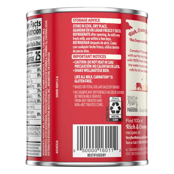 • LONG-LASTING CONVENIENCE: This shelf milk is a must-have in your pantry. Carnation evaporated milk is stored in a recyclable metal can. Shake well before use and refrigerate after opening. Use our evaporated milk within a few days to maintain freshness and quality