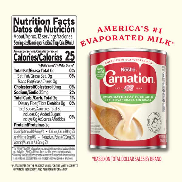 Discover The Rich And Creamy Versatility Of Nestlé Carnation Evaporated Fat-Free Milk, Your Go-To Cooking Milk For Culinary Delights. Crafted With The Highest Quality Ingredients, Carnation Evaporated Milk Is A Canned Milk With Half The Water Removed, Resulting In A Concentrated And Creamy Texture That Enhances Both Sweet And Savory Recipes. With Added Vitamin A And D, This Canned Milk Makes A Great Addition To Any Recipe. Carnation Evaporated Milk Is Ideal For Creating Indulgent Dishes Such As Mac And Cheese, Mashed Potatoes, Flan, Tres Leches, Pies, And Fudge. Conveniently Packaged In A Recyclable Metal Can, Our Evaporated Fat-Free Milk Is Designed For Long Shelf Life, Making It A Practical Addition To Your Pantry. Simply Shake Well Before Use, Refrigerate After Opening, And Consume Within A Few Days. Store In A Cool, Dry Place To Maintain Its Freshness And Quality.