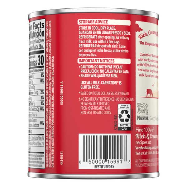 • LONG-LASTING CONVENIENCE: This shelf stable milk is a must-have in your pantry. Carnation evaporated milk is stored in a recyclable metal can. Shake well before use and refrigerate after opening. Use our evaporated milk within a few days to maintain freshness and quality