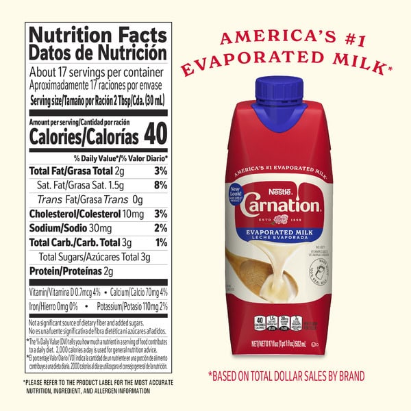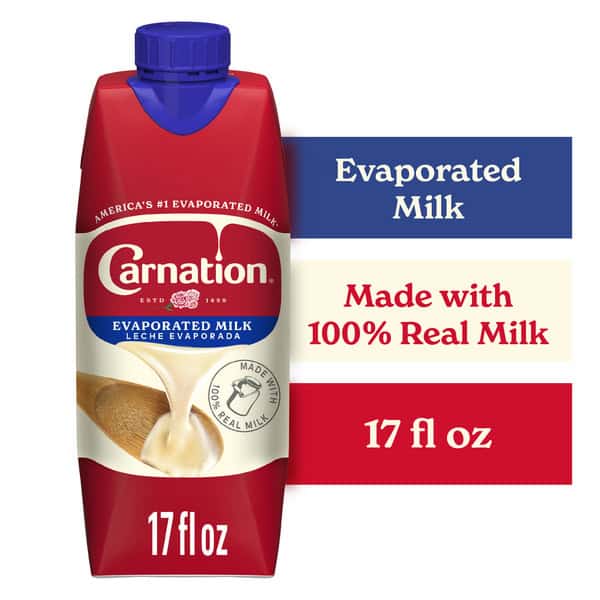 • RICH AND CREAMY: NestlĂ© Carnation Evaporated Milk is the cooking milk enriched with added vitamin D. Made with 100% real milk, it is nutritious and free from rBST*, and the perfect addition for all your recipes.