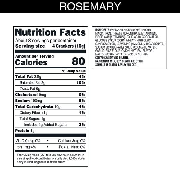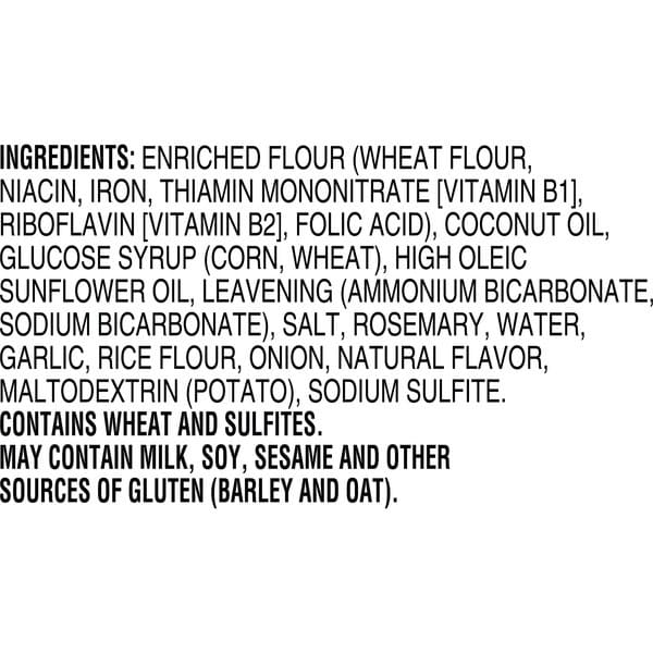Enriched Flour (wheat Flour, Niacin, Reduced Iron, Vitamin B₁ [thiamin Mononitrate], Vitamin B₂ [riboflavin], Folic Acid), High Oleic Sunflower Oil, Rosemary Seasoning (dextrose, Spices [rosemary, Black Pepper], Onion Powder, Garlic Powder, Sugar, Dehydrated Garlic, Sunflower Oil, Natural Flavor), Leavening (ammonium Bicarbonate, Baking Soda, Calcium Phosphate, Yeast), Extra Virgin Olive Oil, Contains 2% Or Less Of Salt, Malted Barley Extract, Sodium Metabisulfite