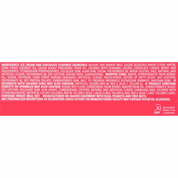Ice Cream And Chocolate Flavored Crunchies: Milkfat And Nonfat And Nonfat Milk, Sugar, Bleached Wheat Flour, Water, Corn Syrup, Coconut Oil, Cocoa Alkali Processed, Palm Oil, Colored With (caramel Color), Chocolate Liquor, Mono And Diglycerides, Tetrasodium Pyrophosphate, Cellulose Gum, Guar Gum, Cocoa, Polysorbate 65, Wheat Gluten, Salt, Natural And Artificial Flavor, Polysorbate 80, Soy Lecithin, Baking Soda, Carrageenan. Whipped Icing: Water, Hydrogenated Palm Kernel Oil, Sugar, Dextrose, Corn Syrup, Sodium Caseinate, Artificial Flavor, Polyglycerol Esters Of Fatty Acids, Soy Lecithin, Polysorbate 60, Soy Protein Isolate, Carbohydrate Gum, Salt, To Preserve Freshness (potassium Sorbate), Xanthan Gum. If Decorated With Colored Icing May Also Contain: Artificial Colors (red 40, Red 3, Blue 1, Yellow 5). If Product Contains Confetti Or Sprinkles May Also Contain: Sugar, Rice Flour, Cornstarch, Palm Kernel And/or Palm Oil, Confectioner’s Glaze, Soy Lecithin, Cellulose Gum, Gum Arabic, Carrageenan, Dextrin, Natural And Artificial Flavor, Carnauba Wax, Colored With (titanium Dioxide), Artificial Colors (yellow 6, Red 40, Yellow 5, Blur 1, Blue 2 Lake, Yellow 6 Lake, Red 3, Blue 1 Lake, Yellow 5 Lake).