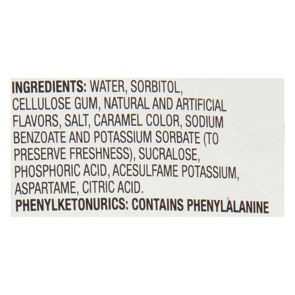 Water, Sorbitol, Cellulose Gum, Natural And Artificial Flavors, Salt, Caramel Color, Sodium Benzoate And Potassium Sorbate (to Preserve Freshness), Sucralose, Phosphoric Acid, Acesulfame Potassium, Aspartame*, Citric Acid.