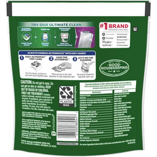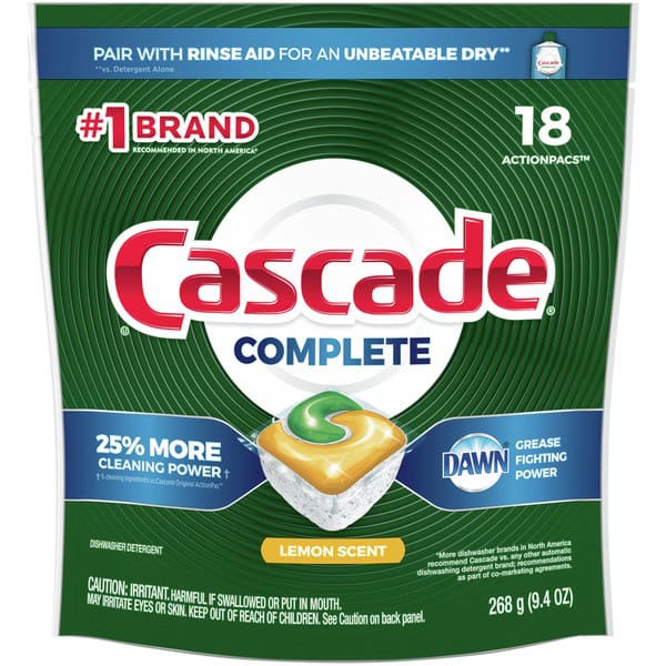 Cascade Complete ActionPacs dishwasher detergent powers away even 24-hour stuck-on messes for a complete clean. That’s because every ActionPac has 25% more Cleaning Power* (*% cleaning ingredients vs. Cascade Original) & is formulated with the grease-fighting power of Dawn dishwashing liquid. Cascade Complete ActionPacs are conveniently premeasured with no finicky wrapping-just toss in a pac. Cascade Complete ActionPacs are phosphate free. Plus, Cascade Complete ActionPacs dissolve quickly to unleash cleaning power early in the cycle. For best results, use Cascade Complete ActionPacs with Cascade Power Dry Rinse Aid for powerful drying and Cascade Dishwasher Cleaner to keep your dishwasher machine sparkling. Save up to 15 gallons of water per dishwasher load when you skip the pre-wash and run your dishwasher with Cascade Complete ActionPacs. Cascade is the #1 Recommended Brand in North America** **More dishwasher brands in North America recommend Cascade vs. any other automatic dishwashing detergent brand, recommendations as part of co-marketing agreements.