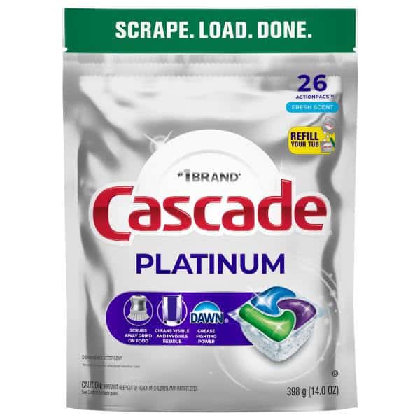 • Cascade Platinum ActionPacs dishwasher detergent cleans burnt-on messes in just one wash, with no pre-wash needed.