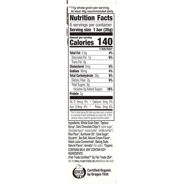 Whole Grain Oats*, Tapioca Syrup*, Dark Chocolate Chips*+ (cane Sugar*, Chocolate Liquor*, Cocoa Butter*, Vanilla Extract*), Rice Flour*, Sunflower Oil*, Cane Sugar*, Glycerin, Sea Salt, Raisin Juice Concentrate*, Baking Soda, Natural Flavor*, Natural Cream Flavor*, Annatto* (for Color).