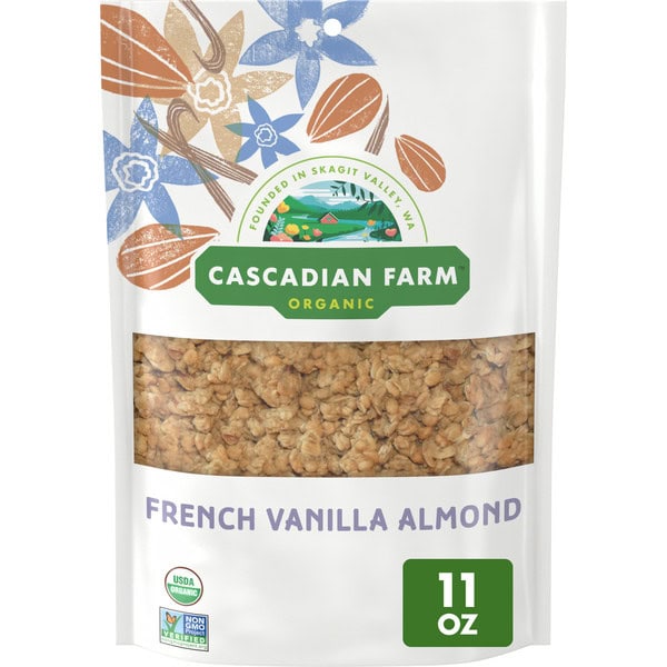 Cascadian Farm Organic French Vanilla Almond Granola comes with delicious whole grain oats, crisp rice, sliced almonds and a touch of vanilla flavor. With 30 grams of whole grain* and 3 grams of fiber per serving, this hearty organic granola helps start the day right. Eat this granola cereal with milk, on top of your favorite Greek yogurt, or even enjoy by the handful on your next hike! Now in a convenient resealable pouch. Keep extra granola handy for an anytime snack.
