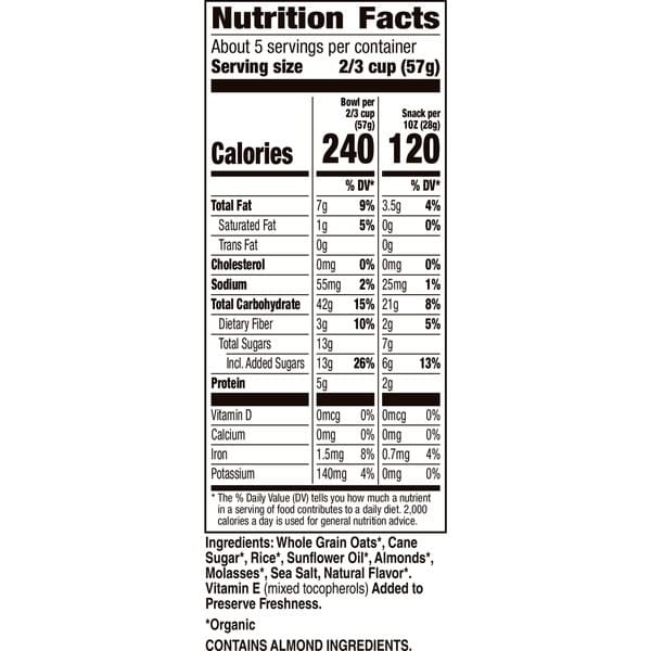 Whole Grain Oats*, Cane Sugar*, Rice*, Sunflower Oil*, Almonds*, Molasses*, Sea Salt, Natural Flavor*. Vitamin E (mixed Tocopherols) Added To Preserve Freshness.