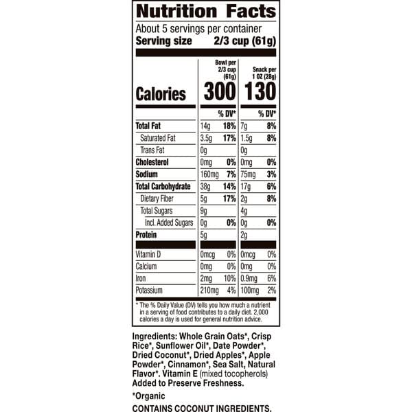 Whole Grain Oats*, Crisp Rice*, Sunflower Oil*, Date Powder*, Dried Coconut*, Dried Apples*, Apple Powder*, Cinnamon*, Sea Salt, Natural Flavor*. Vitamin E (mixed Tocopherols Added To Preserve Freshness., *organic