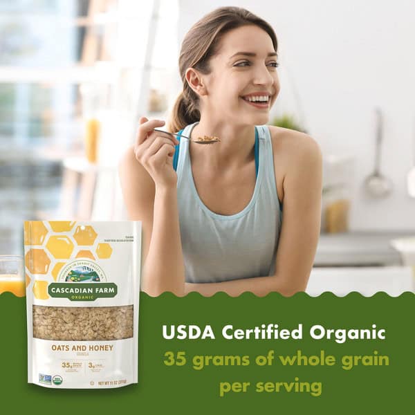 Cascadian Farm Organic Oats and Honey Granola comes with delicious whole grain oats and golden honey. With 35 grams of whole grain* and 3 grams of fiber per serving, this hearty organic granola helps you start the day right. Start your morning with a bowl full of honey oats granola and milk, top your favorite Greek yogurt or enjoy it by the handful on your next hike. Now in a convenient resealable pouch. Keep an extra pouch in your pantry for a crunchy anytime snack.