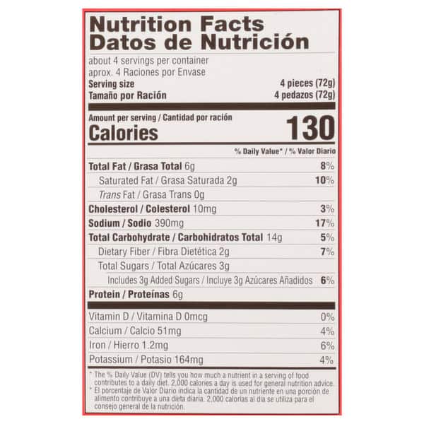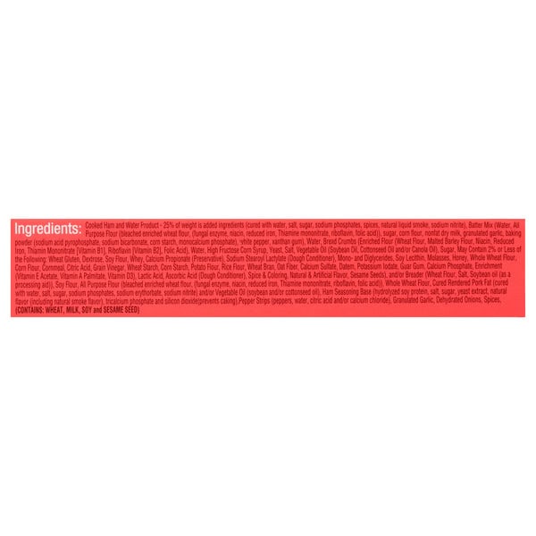 Cooked Ham And Water Product – 25% Of Weight Is Added Ingredients (cured With Water, Salt, Sugar, Sodium Phosphates, Natural Liquid Smoke, Monosodium Glutamate, Sodium Nitrite), Batter Mix (all Purpose Flour (bleached Enriched Wheat Flour, (fungal Enzyme, Niacin, Reduced Iron, Thiamine Mononitrate, Riboflavin, Folic Acid)), Sugar, Corn Flour, Nonfat Dry Milk, Granulated Garlic, Baking Powder (sodium Acid Pyrophosphate, Sodium Bicarbonate, Corn Starch, Monocalcium Phosphate), White Pepper, Xanthan Gum, Monosodium Glutamate), Water, Bread Crumbs (enriched Flour (containing Wheat Flour, Niacin, Reduced Iron, Thiamine Mononitrate, Riboflavin And Folic Acid), Corn Syrup, Sugar, Vegetable Shortening (one Or More Of The Following: Partially Hydrogenated Soybean Oil, And/or Cottonseed Oil), Yeast, Contains 2% Or Less Of The Following: Salt, Soy Flour, Whey, Sodium Stearoyl, 2 Lactylate (dough Conditioner), Calcium Propionate (preservative), Sesame Seed) And/or Breader (wheat Flour, Salt, Whey, Soybean Oil), Soy Protein Concentrate And/or Soy Flour, All Purpose Flour (bleached Enriched Wheat Flour, (fungal Enzyme, Niacin, Reduced Iron, Thiamine Mononitrate, Riboflavin, Folic Acid)), Whole Wheat Flour, Rendered Pork Fat (cured With Water, Salt, Sugar, Sodium Phosphates, Sodium Erythorbate, Sodium Nitrite) And/or Vegetable Oil (soybean And/or Cottonseed Oil), Dehydrated Potato Flakes (potatoes, Mono & Diglycerides, Sodium Acid Pyrophosphate, Citric Acid), Ham Seasoning Base (hydrolyzed Soy Protein, Salt, Sugar, Flavorings (including Autolyzed Yeast Extract, Natural Smoke Flavor), Less Than 2% Tricalcium Phosphate To Prevent Caking), Pepper Strips (peppers, Water, Citric Acid And/or Calcium Chloride), Granulated Garlic, Dehydrated Onions, Spices, Red Gel Based Color (water, High Fructose Corn Syrup, Corn Syrup, Glycerine, Sorbitol, Fd&c Red 40 (129), Sugar, Modified Food Starch, Fd&c Red 3 (e127), Salt, Carrageenan, Agar Gum, Potassium Sorbate, Sodium Benzoate (as Preservatives), Citric Acid).