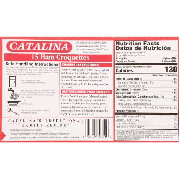 Cooking Instructions: Deep Fry: Preheat oil to 350 degrees F. Use enough oil to fully cover the Catalina Croquettes. Fry the Croquettes for 5 minutes. Let product set for 2 minutes. Minimum internal temperature reached should be 158 degrees F. Do not fry more than 4 at a time.