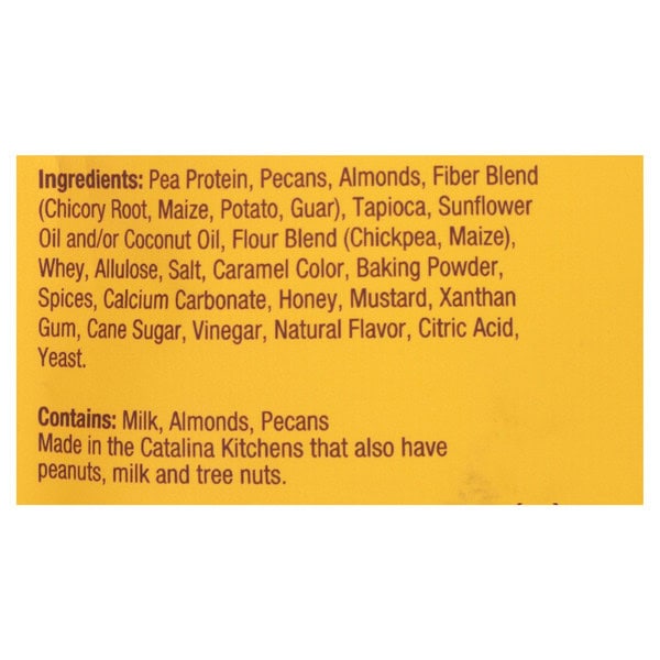 Pea Protein, Pecans, Almonds, Fiber Blend (chicory Root, Maize, Potato, Guar), Tapioca, Sunflower Oil And/or Coconut Oil, Flour Blend (chickpea, Maize), Whey, Allulose, Salt, Caramel Color, Baking Powder, Spices, Calcium Carbonate, Honey, Mustard, Xanthan Gum, Cane Sugar, Vinegar, Natural Flavor, Citric Acid, Yeast