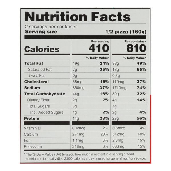 Cook thoroughly. Cooking Instructions: Conventional Oven Recommended: 1. Preheat oven to 425 degrees F. 2. Remove pizza from box, overwrap & cardboard. 3. Cook pizza directly on the middle rack (no pan needed) until cheese is golden brown and crust is crispy, typically 13-16 minutes. Product must be cooked thoroughly to 160 degrees F for food safety and quality. Do not thaw pizza before cooking. Cook from frozen. You oven temperature may vary so adjust baking time & oven temperature as necessary.