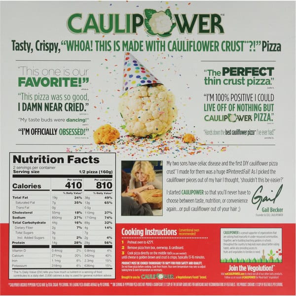 The best just got better! Now stone-fired. America’s no. 1 cauliflower crust (Spins annual FZ pizza data (8/9/20)) (One serving of pepperoni pizza does not provide a significant (1/2 cup) of the dietary guidelines for Americans only recommendations of vegetables. This product contains 1/3 cup of vegetables per serving). Live life on the veg. Not ready to eat. On our stone-fried cauliflower crust (One serving of pepperoni pizza does not provide a significant (1/2 cup) of the dietary guidelines for Americans only recommendations of vegetables. This product contains 1/3 cup of vegetables per serving). Tasty, crispy, whoa! This is made with cauliflower crust (One serving of pepperoni pizza does not provide a significant (1/2 cup) of the dietary guidelines for Americans only recommendations of vegetables. This product contains 1/3 cup of vegetables per serving)!