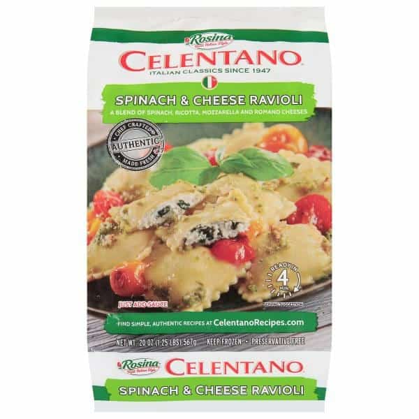 Filling: Ricotta Cheese (pasteurized Milk, Whey, Vinegar, Salt, Xanthan Gum, Locust Bean Gum, Guar Gum), Water, Spinach, Mozzarella Cheese (pasteurized Whole Milk, Cheese Cultures, Salt, Enzymes), Romano Cheese (pasteurized Cow’s And Sheep’s Milk, Rennet, Salt, Cheese Cultures, Enzymes), Garlic Puree (garlic, Citric Acid), Bread Crumbs (wheat Flour), Dried Whole Eggs, Salt, Garlic Powder, Spices, Flavoring (sunflower Oil, Natural Flavors). Pasta: Enriched Durum Flour (wheat Flour, Niacin, Reduced Iron, Thiamine Mononitrate, Riboflavin, Folic Acid), Water, Dried Whole Eggs, Turmeric.