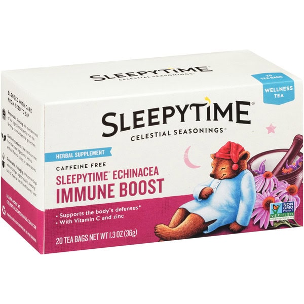 Celestial Seasonings Sleepytime Echinacea Complete Care Wellness Tea can provide immune system support whether you’re feeling under the weather or just want to be prepared. This powerful blend features Echinacea, used for centuries to help maintain the body’s defenses, along with immune-supporting Vitamin C, zinc and elderberry. And because it has our treasured Sleepytime blend of soothing herbs like chamomile and lemongrass, it’s also a delicious way to relax and unwind whenever you need it.