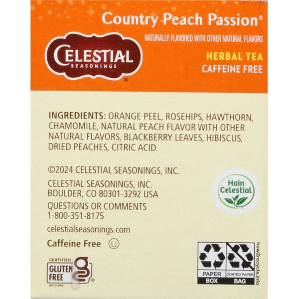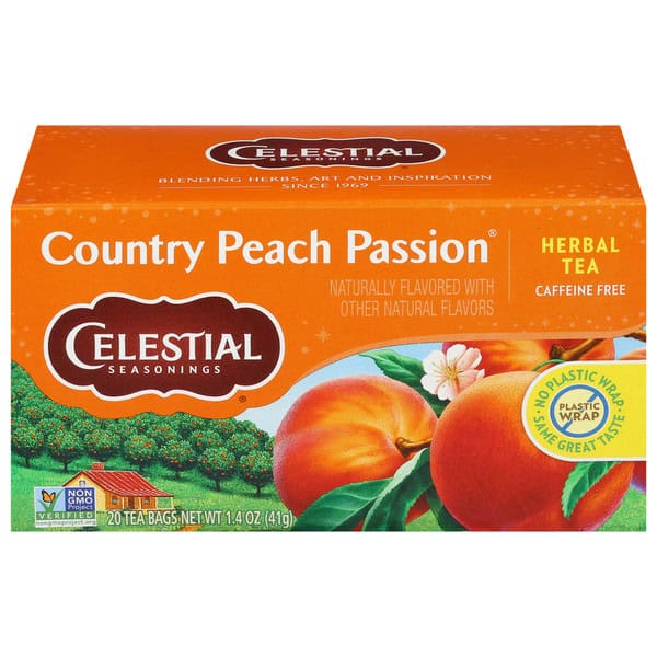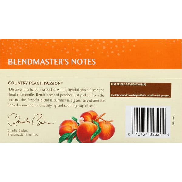 Blending herbs, art and inspiration. Blendmaster’s Notes: Country Peach Passion: Discover this herbal tea packed with juicy peach flavor and floral chamomile. Reminiscent of peaches just picked from the orchard-this flavorful blend is summer in a glass served over ice. Served warm and it’s a satisfying and soothing cup of tea. – Charlie Baden, Celestial Seasonings Blendmaster. The Story of Celestial Seasonings: Back in 1969, we started picking herbs from the fields and forests of the Rocky Mountains and at that moment, we created America’s very first herbal tea. Still blended in Boulder by our expert Blendmaster, our uniquely delicious teas are made with the finest ingredients, passion and inspiration. An apple is an excellent thing – until you have tried a peach. – George du Maurier.