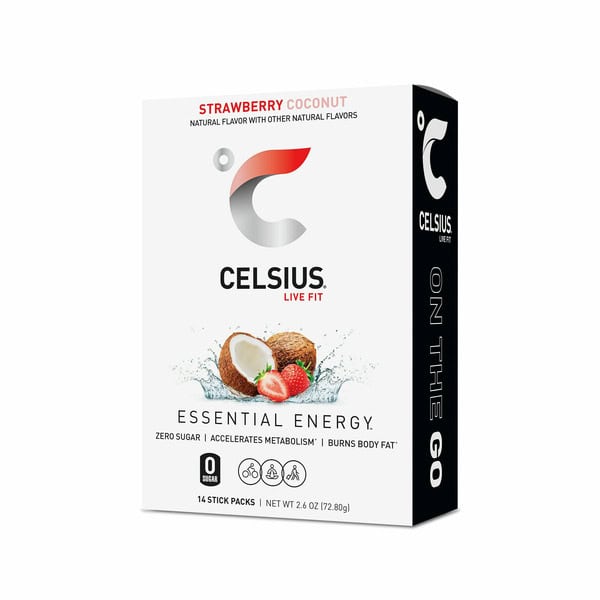 CELSIUS® is functional, Essential Energy– a better-for-you, premium alternative to traditional energy drinks, made with 7 essential vitamins and zero sugar. As a global, lifestyle fitness drink, CELSIUS® was created to help people LIVE FIT, exceed their goals and elevate their everyday lives. Our CELSIUS® On-the-Go Powder Sticks contain the same clinically proven ingredients as CELSIUS®, only its compact, convenient and perfect for traveling. Whether you’re hiking trails, beachside chillin’ or ski lodge loungin’, CELSIUS® On-the-Go Powder Sticks are ready when you are, so you can be ready for anything. Our proprietary MetaPlus® blend contains green tea extract and EGCG. It also includes guarana seed extract, ginger root for flavor and digestion, vitamin C to support your immune system, vitamin B for energy production, and chromium to help control hunger, making it an ideal pre-workout drink. CELSIUS® On-the-Go Powder Sticks allow you to adjust the powder you use depending on the level of energy boost you require, making it a flexible option. Our powders can be mixed with various liquids, such as water, juice, smoothies and protein shakes, allowing you to personalize the taste and consistency to your liking. Escape to a sun kissed island getaway with each sip of CELSIUS® Strawberry Coconut On-the-Go Powder Sticks, delivering a tropical energy boost with the sweet flavors of tangy strawberries and the creamy richness of coconuts! Enjoy CELSIUS® On-the-Go Powder Sticks anytime, anywhere. Just add water and go! Add one powder stick packet to 12-16 Fl Oz of water and you have Essential Energy on the go. CELSIUS® On-the-Go Powder Sticks have the perfect balance of flavor and energy that serve as an awesome pick-me-up for active lifestyles. One powder stick is equal to one CELSIUS® ready-to-drink can, and each box comes with 14 powder stick packets. Make CELSIUS® Essential Energy your go to pick-me-up– anytime, any place!