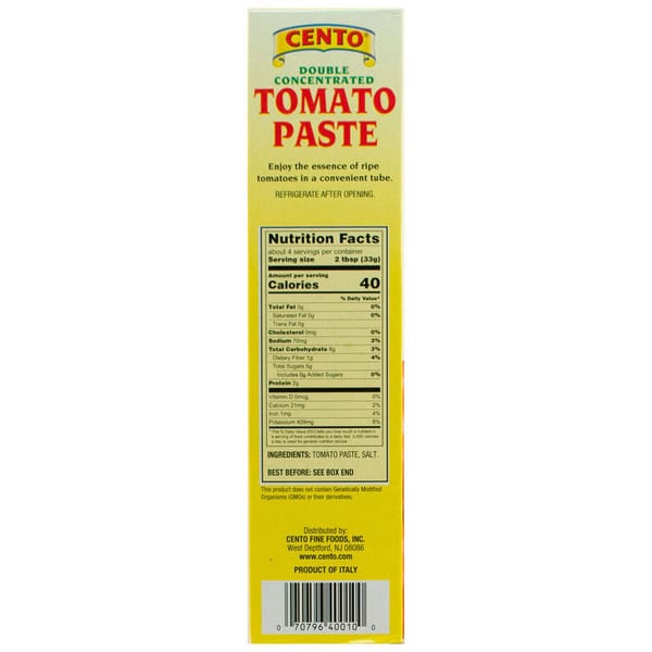 Cento Double Concentrated Tomato Paste is the same rich, thick paste made from fresh red ripe tomatoes, now in a convenient and resealable tube. Easily add a depth of flavor to your soup, sauce or favorite recipes, the convenience and versatility of the tomato paste tube is unparalleled. If your recipe calls for 1 tbsp of canned paste, 1 tbsp of Cento Double Concentrated Tomato Paste in a Tube should be used.