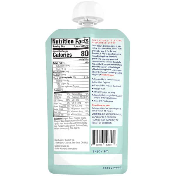 • SUPPORTS COGNITIVE DEVELOPMENT – Cerebelly is the only organic pouch that delivers 16 key brain-supporting nutrients. A delicious blend high in vitamin A, lutein, iron and zinc, as well as 12 other key nutrients to support your baby’s developing brain.