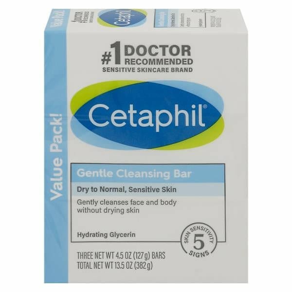 New look same formula. No. 1 dermatologist recommended facial skincare brand. Dry to normal, sensitive skin. Gently cleanses face and body without drying skin. Hydrated glycerin. 5 sign skin sensitivity. This bar is specially formulated with 5 nourishing ingredients to gently cleanse without stripping or drying skin. Leaves your skin feeling soft, clean and hydrated. Defends against 5 Signs of Skin Sensitivity: Weakened. Dryness. Roughness. Skin barrier. Irritation. Tightness. Soap free. Won’t clog pores. Hypoallergenic.