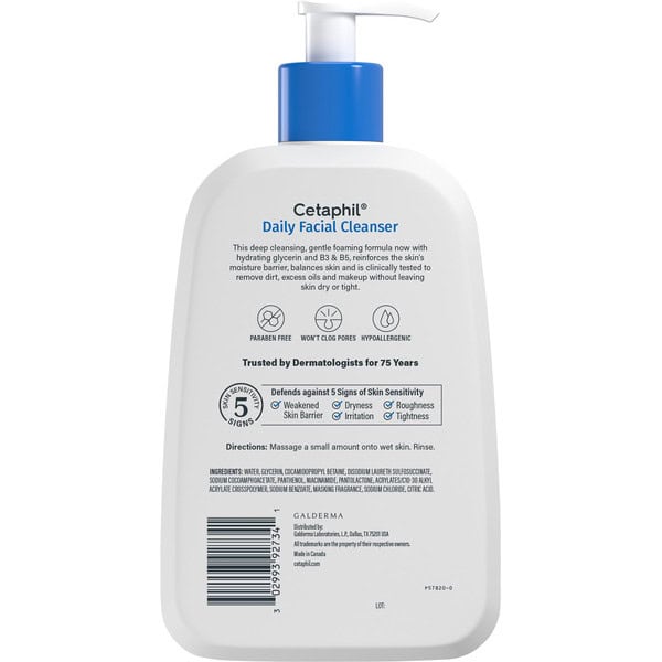 New & improved. No. 1 dermatologist recommended facial skincare brand. Combination to oily, sensitive skin. Deep cleans and minimizes appearance of pores without stripping skin of natural moisture. Hydrating glycerin essential vitamins B5 & B3. 5 signs skin sensitivity. This deep cleansing, gentle foaming formula now with hydrating glycerin and B5 & B3, reinforces the skin’s moisture barrier, balances skin and is clinically tested to remove dirt, excess oils and makeup without leaving skin dry or tight. Paraben free. Won’t clog pores. Hypoallergenic. 5 signs skin sensitivity. Defends against 5 signs of skin sensitivity: Weakened Skin Barrier; Dryness; Roughness; Irritation; Tightness.