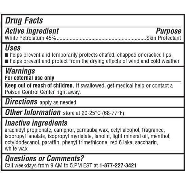 Arachidyl Propionate, Camphor, Carnauba Wax, Cetyl Alcohol, Fragrance, Isopropyl Lanolate, Isopropyl Myristate, Lanolin, Light Mineral Oil, Menthol, Octyldodecanol, Paraffin, Phenyl Trimethicone, Red 6 Lake, Saccharin, White Wax